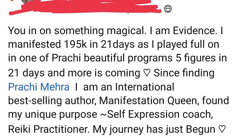 "You are in on something magical. I am Evidence. I manifested 195k in 21days as I played full on in one of Prachi's beautiful programs 5 figures in 21 days money program and more is coming.