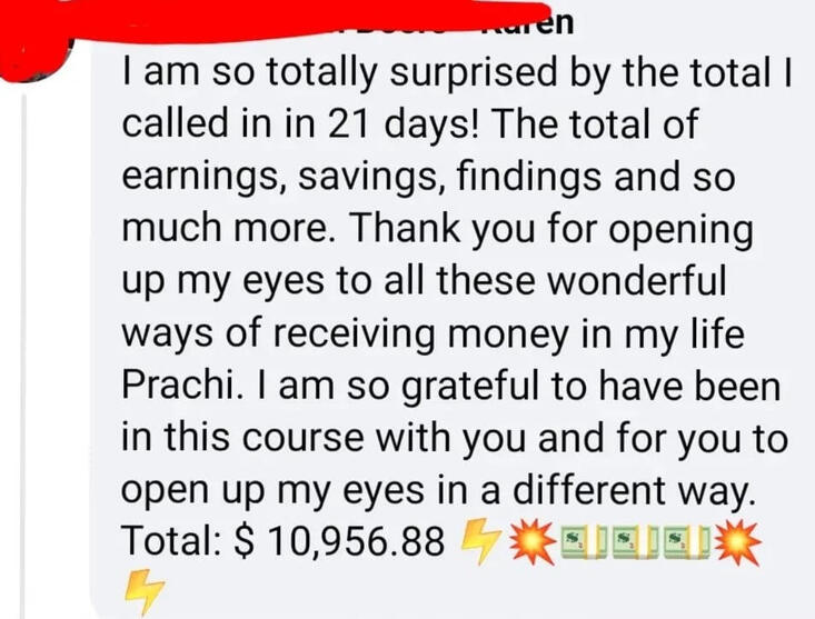"You are in on something magical. I am Evidence. I manifested 195k in 21days as I played full on in one of Prachi's beautiful programs 5 figures in 21 days money program and more is coming.